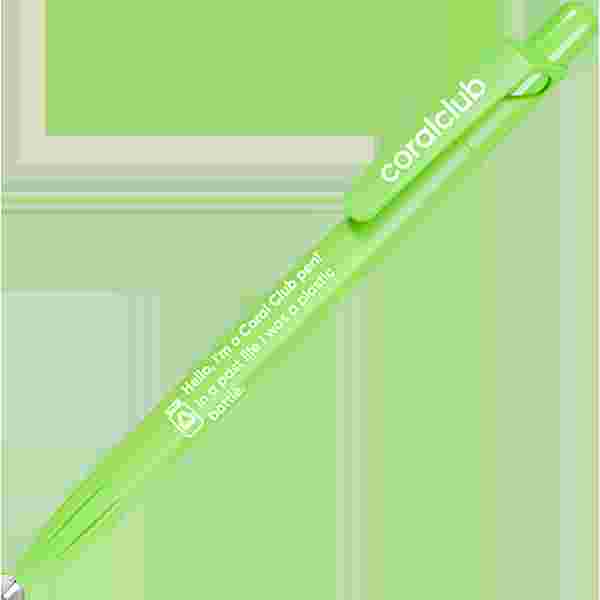 Pix cu bilă și mecanism cu buton, din material PET-RECYCLED cu inscripția „Salut, sunt pixul Coral Club! Într-o viață anterioară am fost sticlă din plastic”.